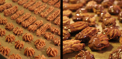 Den Teig mit einer Spritztüte aufs mit Backpapier belegte Blech spritzen. Tupfen oder Stäbchen, wie es beliebt. Alles bei 175 Grad Umluft ca. 8 Minuten backen.