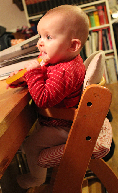 ... ist jetzt unsere Tafelrunde. Gestern haben wir uns einen zweiten Hochstuhl angeschafft. Und nun thront Mascha stolz mit uns am Tisch. Fühlt sich schön an, so ein gut gefüllter Familientisch!
