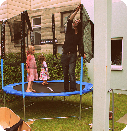 Juchhhu, das sehnsüchtig erwartete Trampolin wurde geliefert. Und fachmännischt aufgebaut.