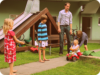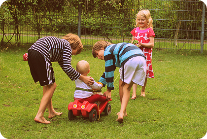 Das man Mascha süß findet, kann ich verstehen. Aber etwas überrascht hat mich dann doch, wie verliebt die beiden Jungs von gegenüber in Mascha sind. Kümmern sich immer liebevollst um sie, spielen mit ihr Ball - oder umsorgen sie bestens auf ihren Bobbycarausfahrten!