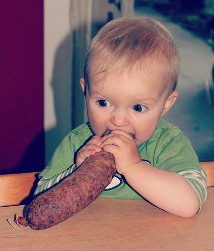 Eigentlich ist es kein Wunder, dass Mascha jetzt schon ziemlich geschickt selbst isst, bei dem Appetit, den sie hat! Hier die ersten Löffelversuche, das klappt in der Zwischenzeit schon viel besser.