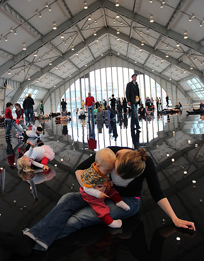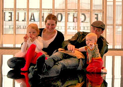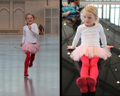Maschas ungewöhnlicher Fortbewegungsstil ruft allenthalben Begeisterung hervor. Hier eine Kostprobe aus den Deichtorhallen, wo die große Freifläche zum Krabbengang bessonders gut geeignet war. Eine Etage höher, auf dem wackligen Horizon Field wollte Mascha dann aber nix mehr vom Krabbeln wissen, da hatte sie Angst und wollte nur auf den Schoß.